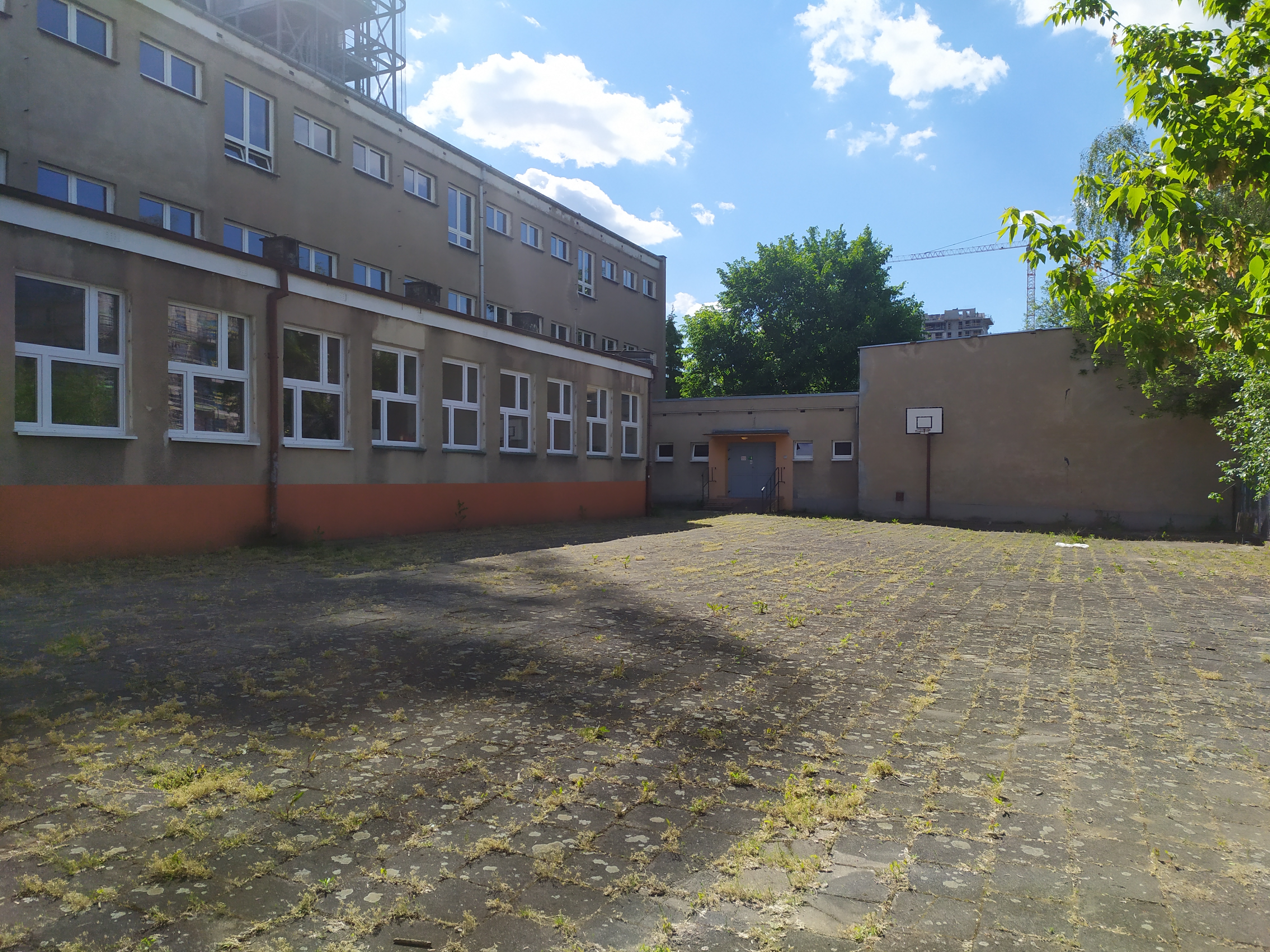 Szkoła posiada dziedziniec, który ze względu na stan techniczny uniemożliwia korzystanie z niego w celach sportowych (nierówna nawierzchnia, porośnięte mchem i chwastami płytki chodnikowe na całej powierzchni). Obiekt jest nieatrakcyjny, nie sprzyja również relaksacji, otoczenie jest szare i zniszczone, mało jest również zieleni. Poza kilkoma ławeczkami na dziedzińcu nie ma nic. Bezpośrednio do dziedzińca przylega „letnia klasa”, która ze względu na zniszczony płot (przez odbywającą się budowę) nie może być używana ze względów bezpieczeństwa. „Klasa letnia” była kiedyś atrakcyjnym miejscem, w którym odbywały się lekcje w przyjemnym otoczeniu przyrody. Obok znajduje się ogród, który też do tej pory nie został zagospodarowany w celach rekreacyjnych. Wystarczy kilka leżaków, hamaków i worków sako by ten obszar sprzyjał wypoczynkowi młodzieży podczas przerw. W ogrodzie mogłyby się również odbywać niektóre zajęcia z zakresu fotografii, plastyki, kreacji reklamy itp.