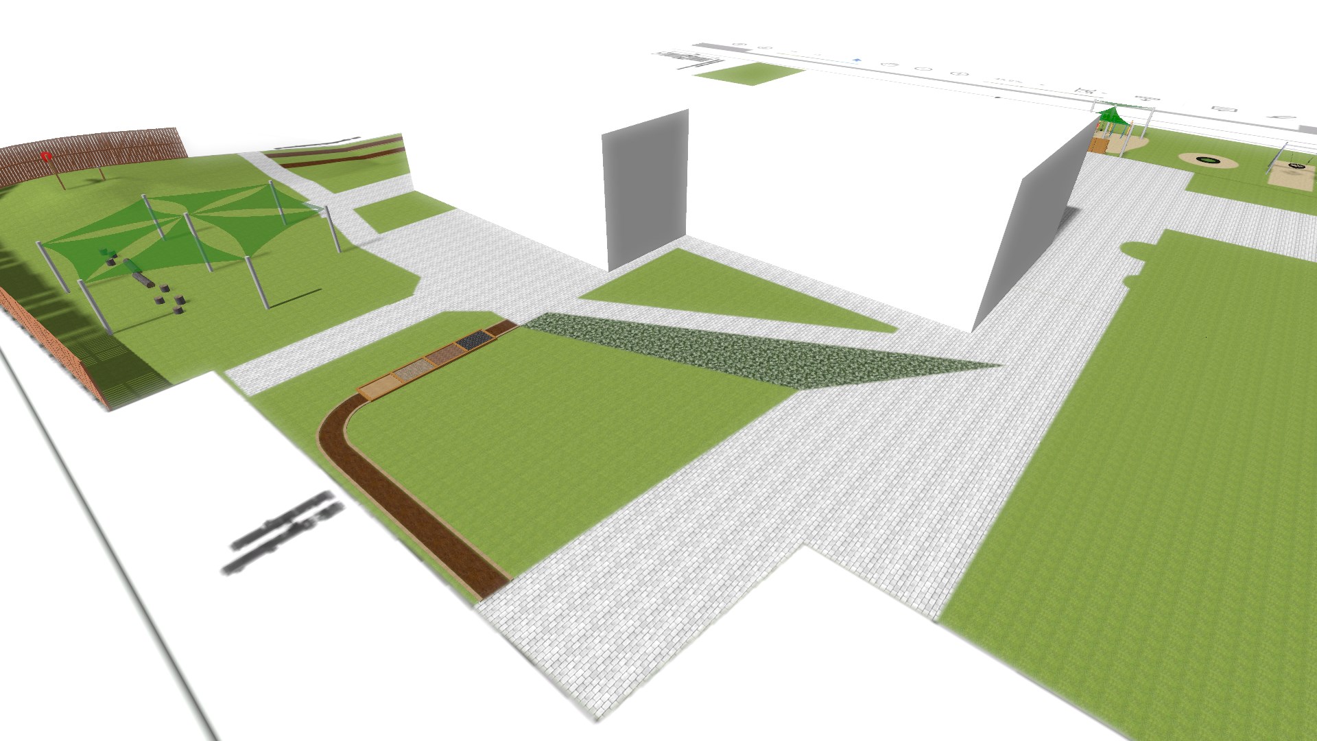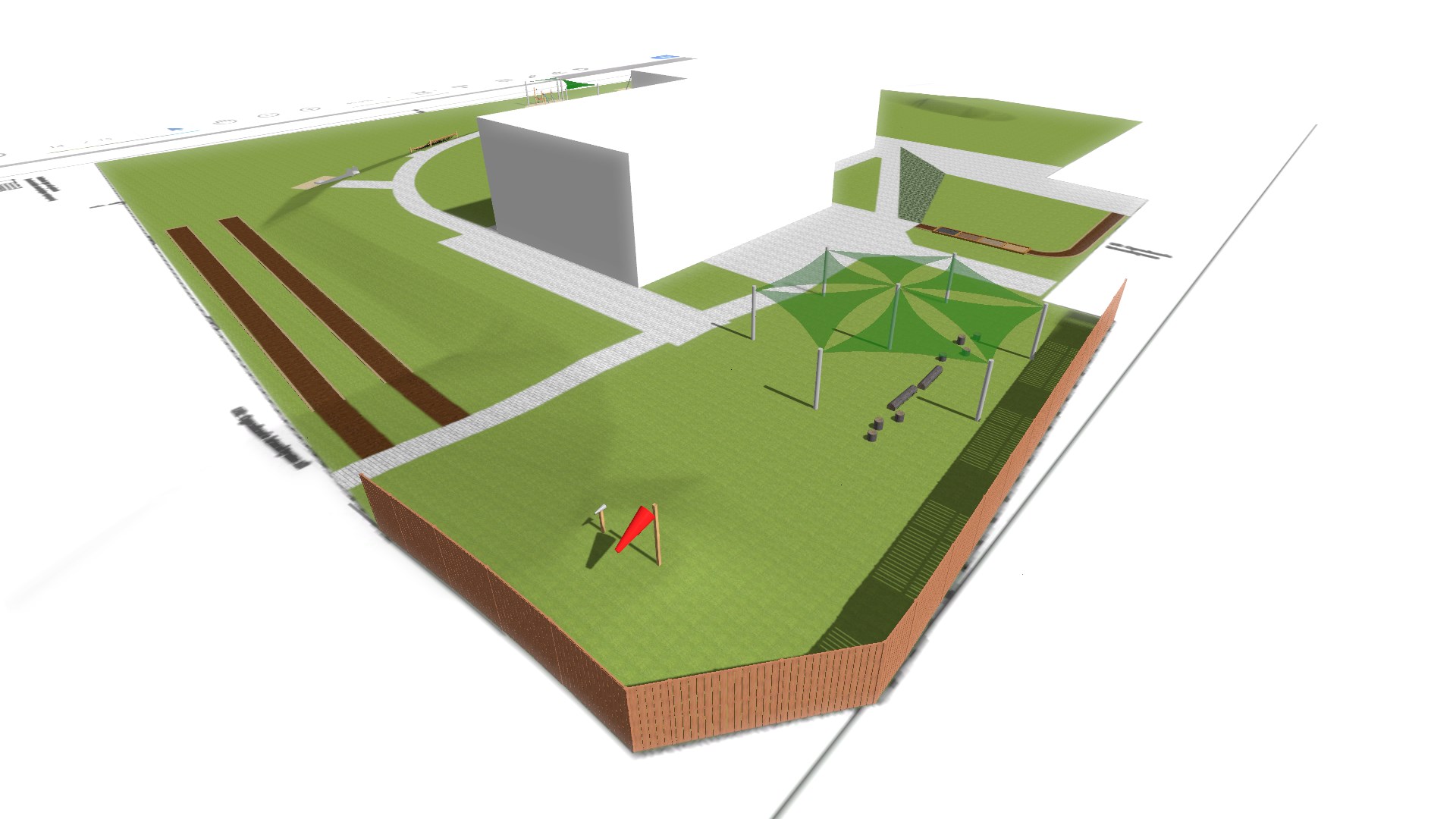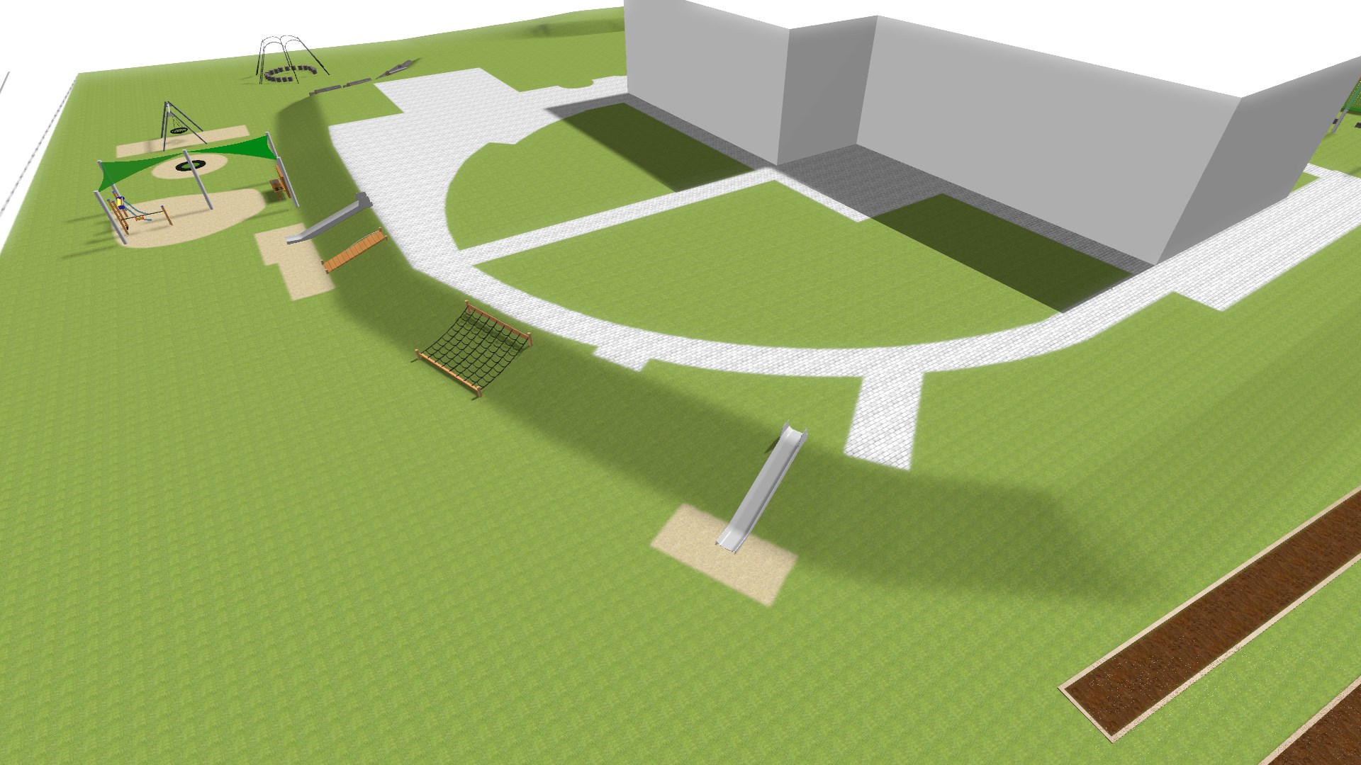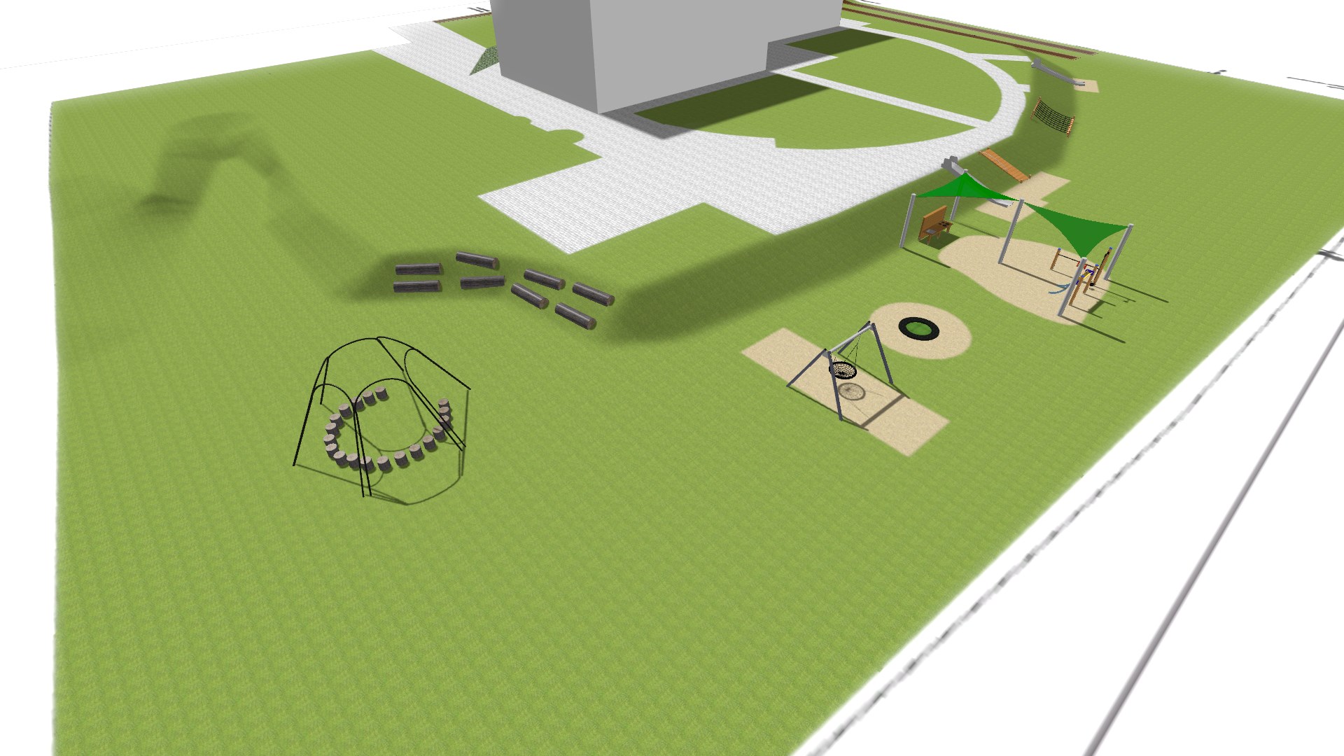 Przy górce piaskowej powstanie strefa piaskowa ze słupkami wielofunkcyjnymi,z elementami do zabawy piaskiem (dźwigi, suwnice, sita, wagi itp.) oraz żaglami przeciwsłonecznymi.