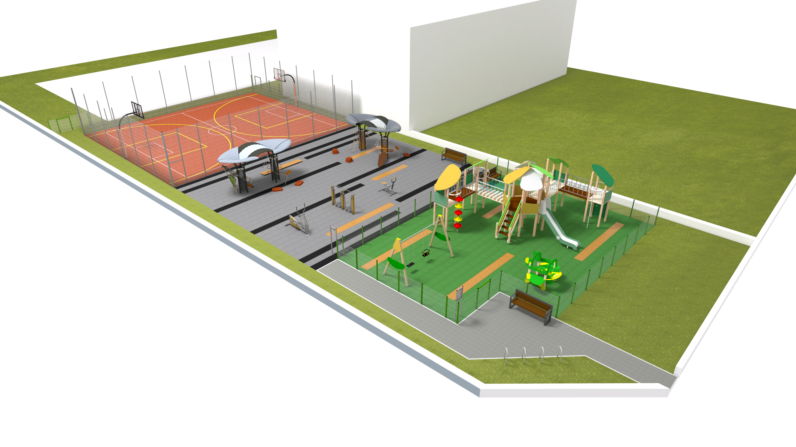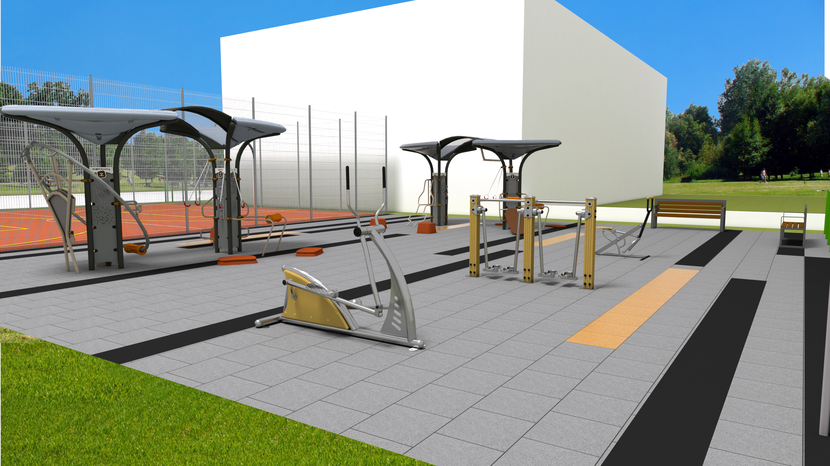 2. Budowę siłowni zewnętrznej o wym. 15m x 17m o nawierzchni amortyzującej z płytek syntetycznych z kolorze szarym, czarnym i żółtym. W tej części planuje się montaż: